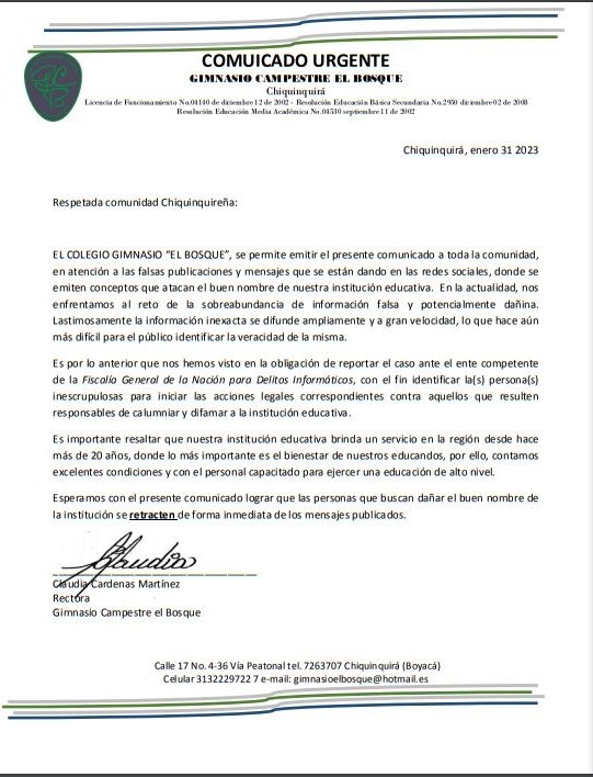COMUNICADO GIMNASIO CAMPESTRE EL BOSQUE
